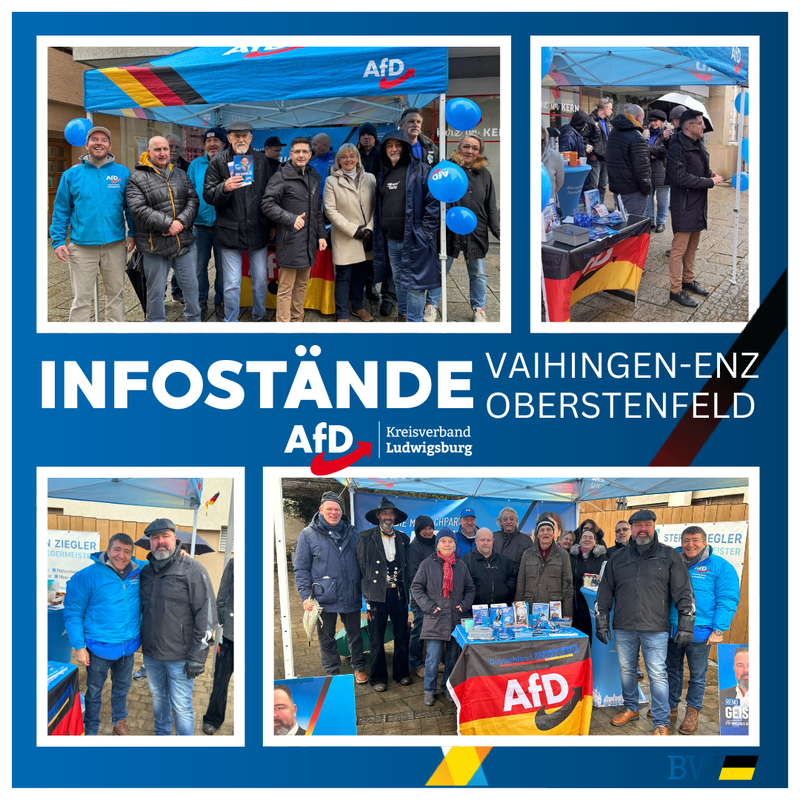 Auch am vergangenen Samstag war der Kreisverband Ludwigsburg in Sachen "Deutschland.Aber normal." wieder auf der Straße. Mit zwei parrallel stattfindenden Infoständen waren wir diesmal in Aldingen und Bietigheim-Bissingen unterwegs. Mit dabei wieder viele engagierte Mitglieder, ein Großteil des Kreisvorstandes und natürlich unser Spitzenkandidat für Ludwigsburg, Martin Hess (MdB).