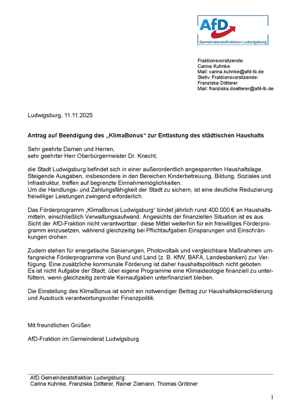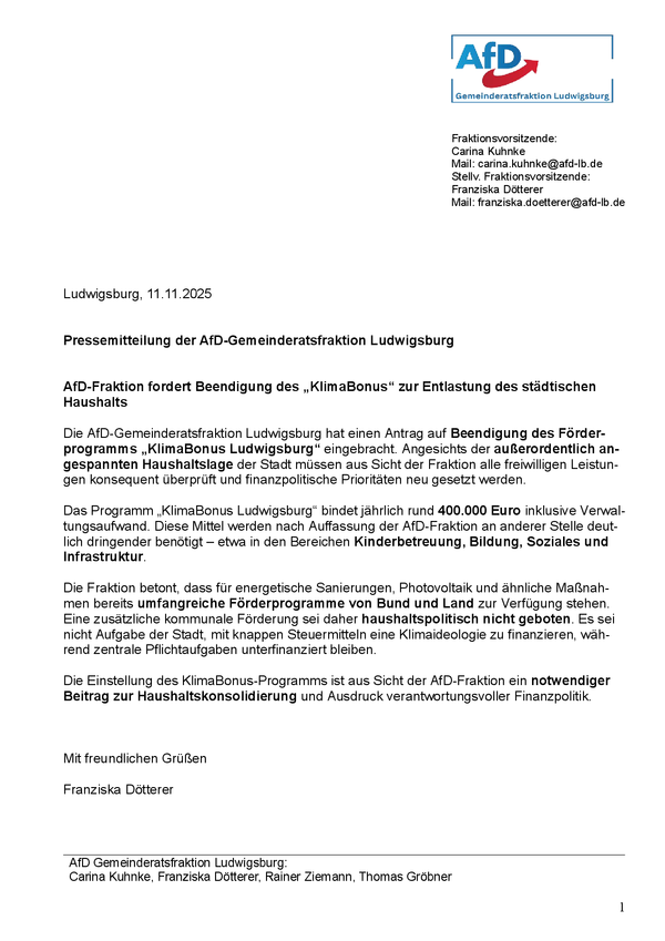 Pressemitteilung der AfD Kreistagsfraktion Ludwigsburg