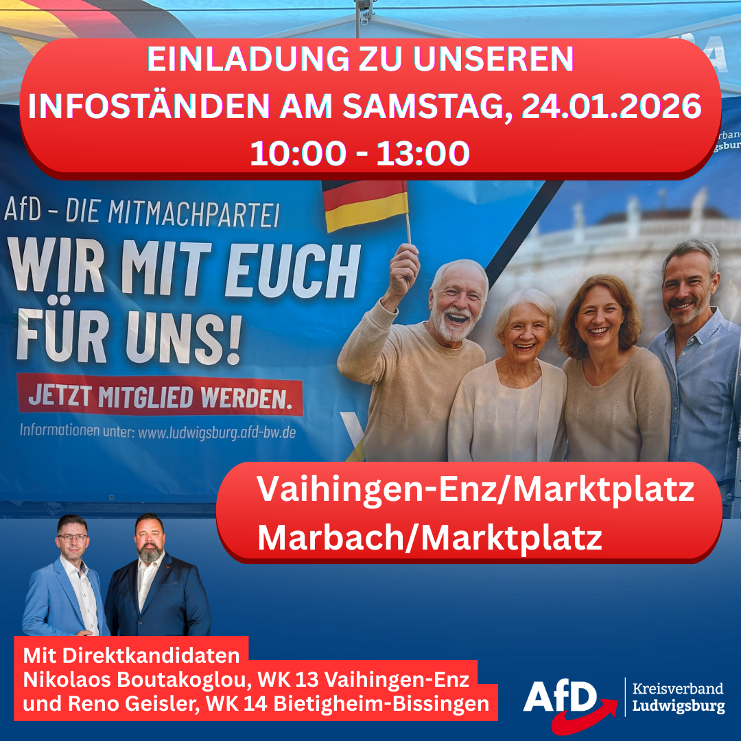 weiter geht es, wie am laufenden Band, mit den nächsten Infoständen am 24.01.2026. Bleiben wir gemeinsam am Ball, um ein super Ergebnis für unser Schwabenländle einzufahren!