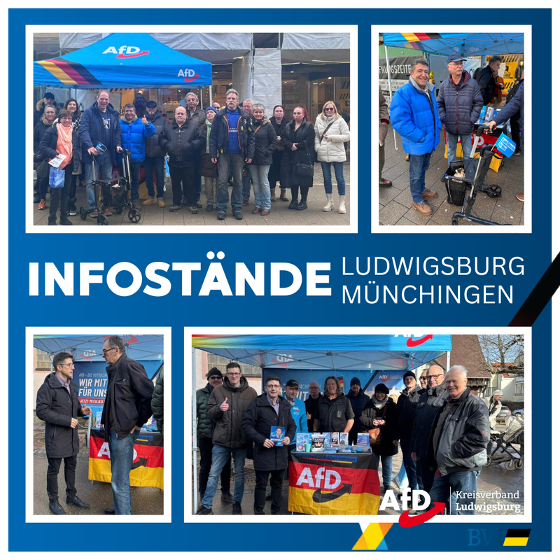 Liebe Mitglieder, Förderer und Freunde unserer AfD Ludwigsburg, wir haben Halbzeit! Die ersten 4 Infostände haben wir erfolgreich gemeistert. Bis zur Landtagswahl stehen noch 4 weitere auf dem Programm! Am Samstag, 14.02.2026 haben wir folgende Stellplätze gebucht: Stand 1 Wann:      Â...